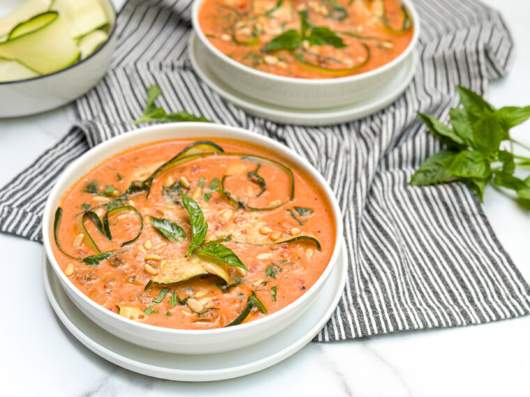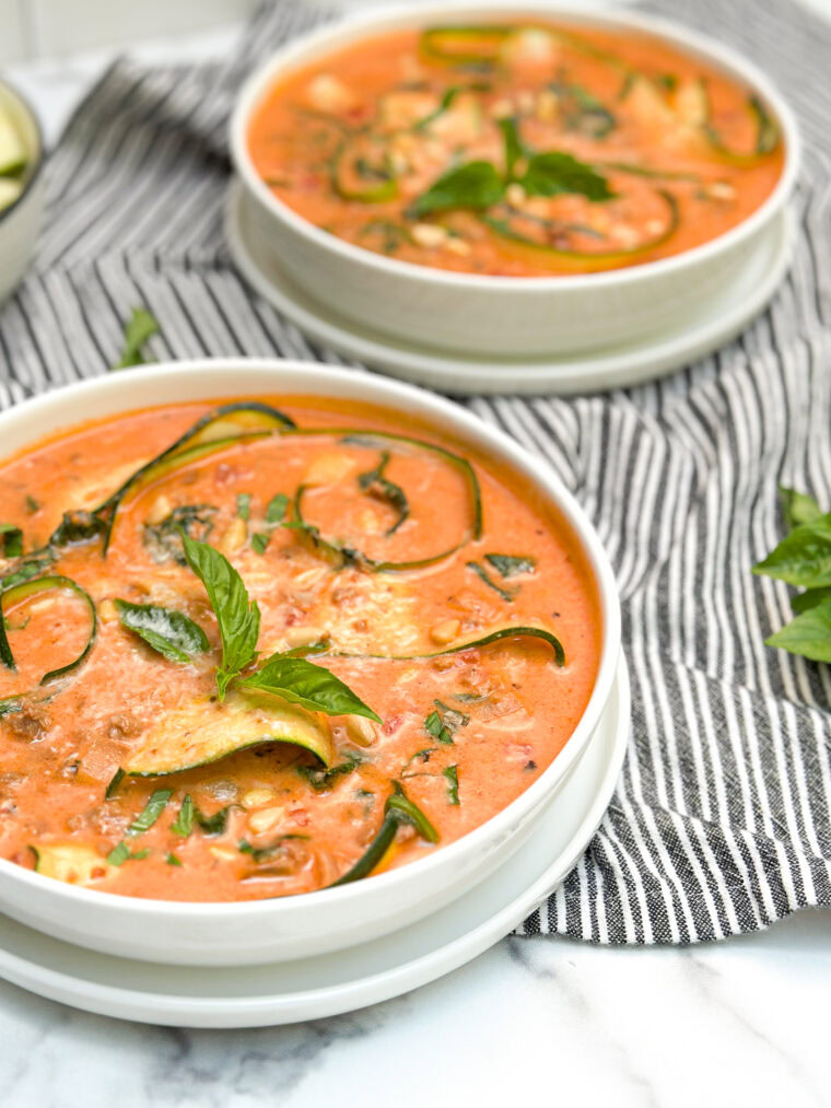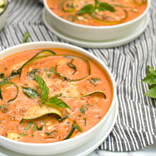 We’re talking rich tomato broth, Italian turkey sausage, ribbons of zucchini, and a velvety cashew cream swirl that makes the whole thing feel a little fancy—but takes less than an hour start to finish.