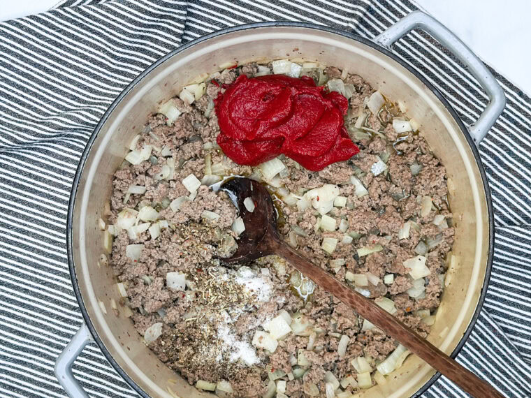Let it cook for a minute or two to caramelize—it deepens the flavor and gives that rich, cozy lasagna taste we’re going for.