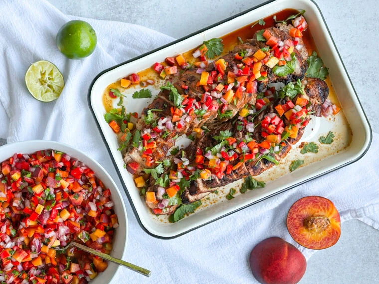 Plate your pork and spoon that fresh peach salsa right over the top (or serve it on the side if you’re feeling fancy).