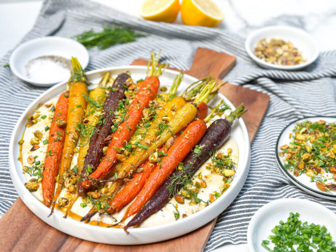 Whether you’re feeding your friends, impressing the in-laws, or just trying to romanticize your Tuesday dinner, this maple roasted carrots with whipped tahini and dill pistachio gremolata is the side dish that delivers every single time.