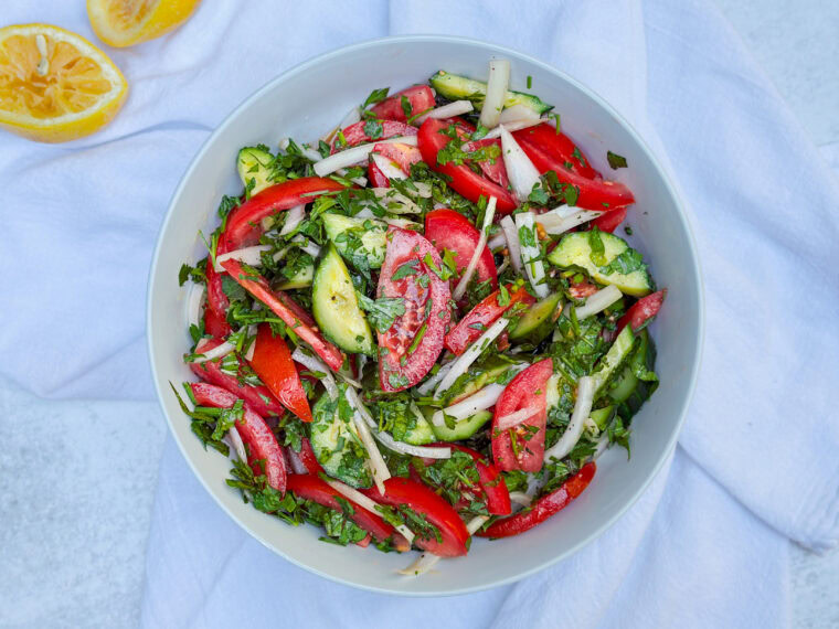 In a large bowl, add your cucumber, tomato, red onion, parsley, and mint. Drizzle in the olive oil and lemon juice, season with salt and pepper, and toss until everything’s well coated and glistening.