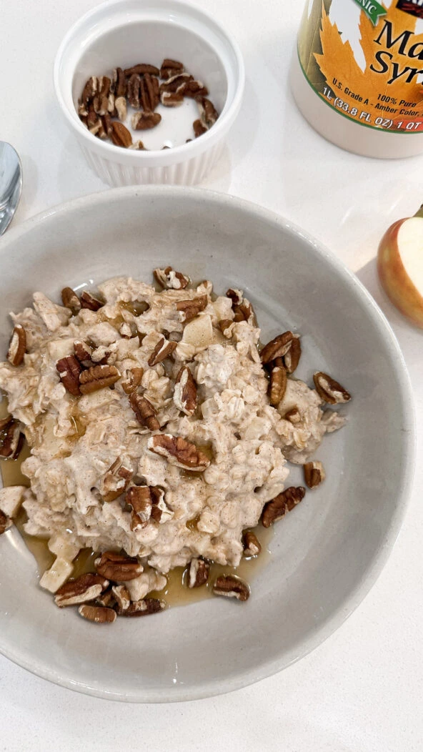 - Breakfast was old fashioned oats, which I cooked with almond milk, cinnamon, chopped pecans and a little bit of maple syrup.