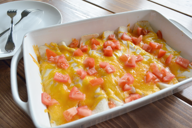 - Fill six whole wheat tortillas (I used gluten free tortillas) with filling mix and roll, placing seam side down in a baking pan.